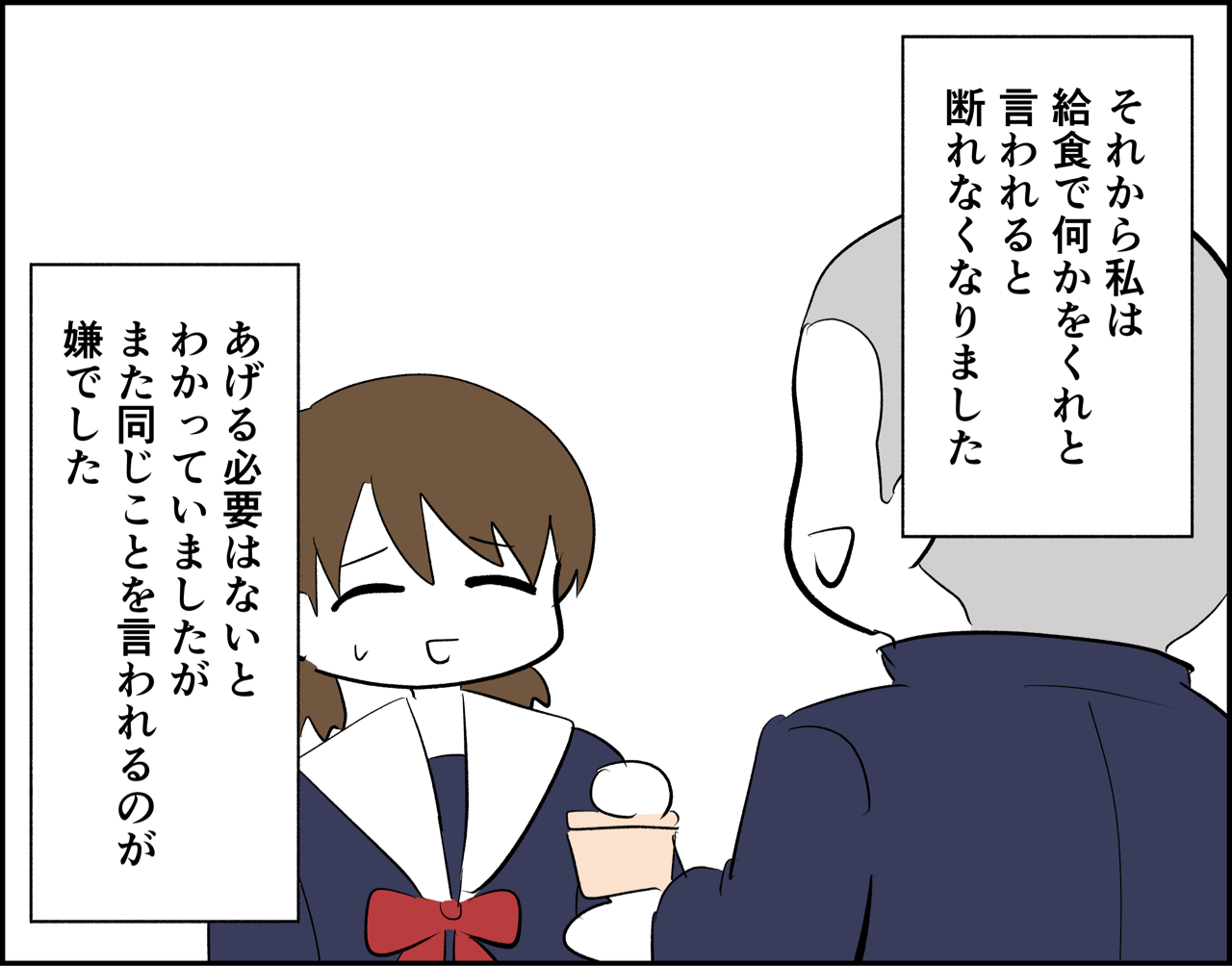 デブが給食を残さず食べたら 2023年12月19日 おかわりめちゃくちゃしてたとかじゃなくて普通に出された分食べただけなんですけどね???許さん 「短編」カテゴリの最新記事 タグ :#エッセイ#エッセイ漫画#デブ#給食#学生時代 < 前の記事次の記事 > コメント コメント一覧 (2) 1. プレハブ校舎の壁殴り凹ませ大会優勝 2024年02月28日 08:33 おそらくセミさん優しくて親しみやすそうな感じがするので、イジりやすかったのではないでしょうか?笑 だから言ってた男子達もそんなに本気では言ってなかったと思います笑 あくまで推測ですが、、 0 maikawa_semi がしました 2. まいかわセミ 2024年03月01日 14:49 >>1 優しくはないと思いますがいじられキャラではありましたね…😂 ノリで言ってる人がほとんどでたぶん深い意味はなかったんでしょうね〜大人になった今わかります、、 ! 0 maikawa_semi がしました このブログにコメントするにはログインが必要です。 さんログアウト この記事には許可ユーザしかコメントができません。 コメントフォーム 名前 コメント 記事の評価 リセット リセット 顔 星 情報を記憶 コメントを投稿する
